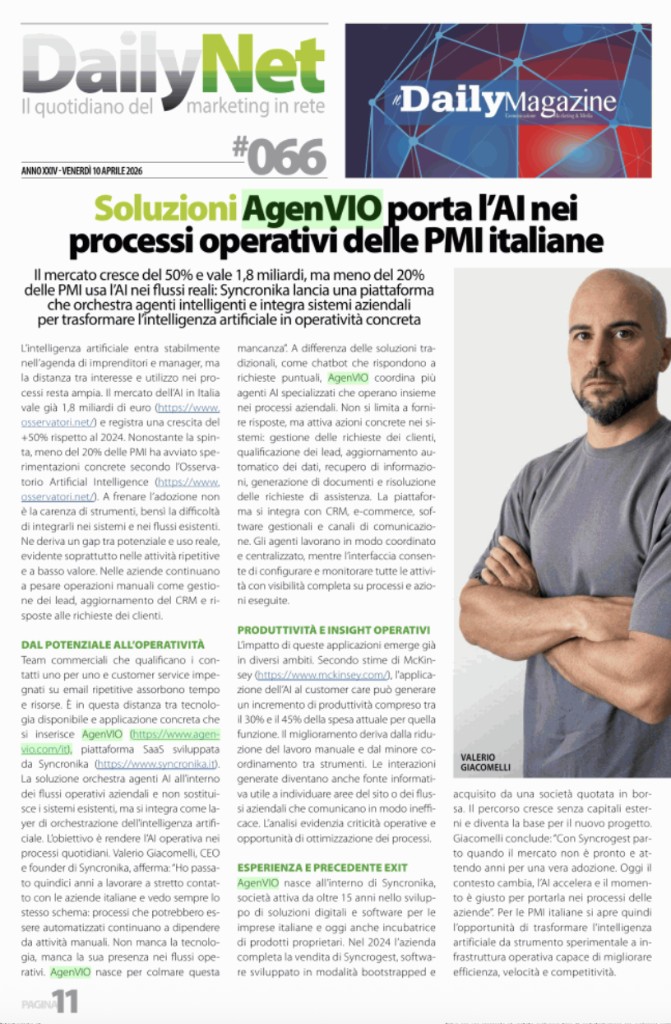 Sotto: pagina del 10 aprile 2026 — articolo in italiano su AgenVIO, Syncronika e il contesto delle PMI.